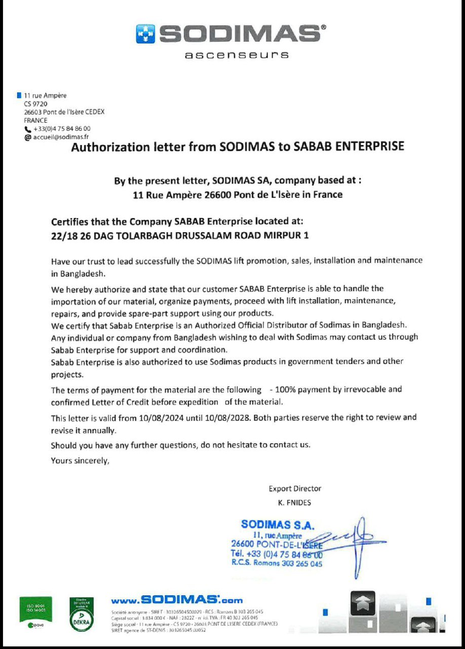 Now Sabab Enterprise / Sabab Elevator & Engineering Ltd. assembled Fuji brand elevator & Escalator from China. SABAB ENTERPRISE also import Generator & Transformer & Garments Equipment’s.